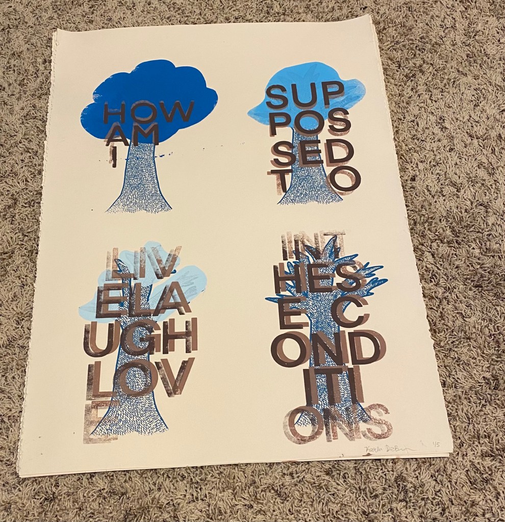 I chose the saying from Tik Tok, “How am I supposed to live laugh love in these conditions.”