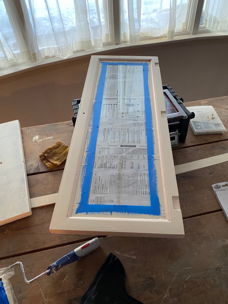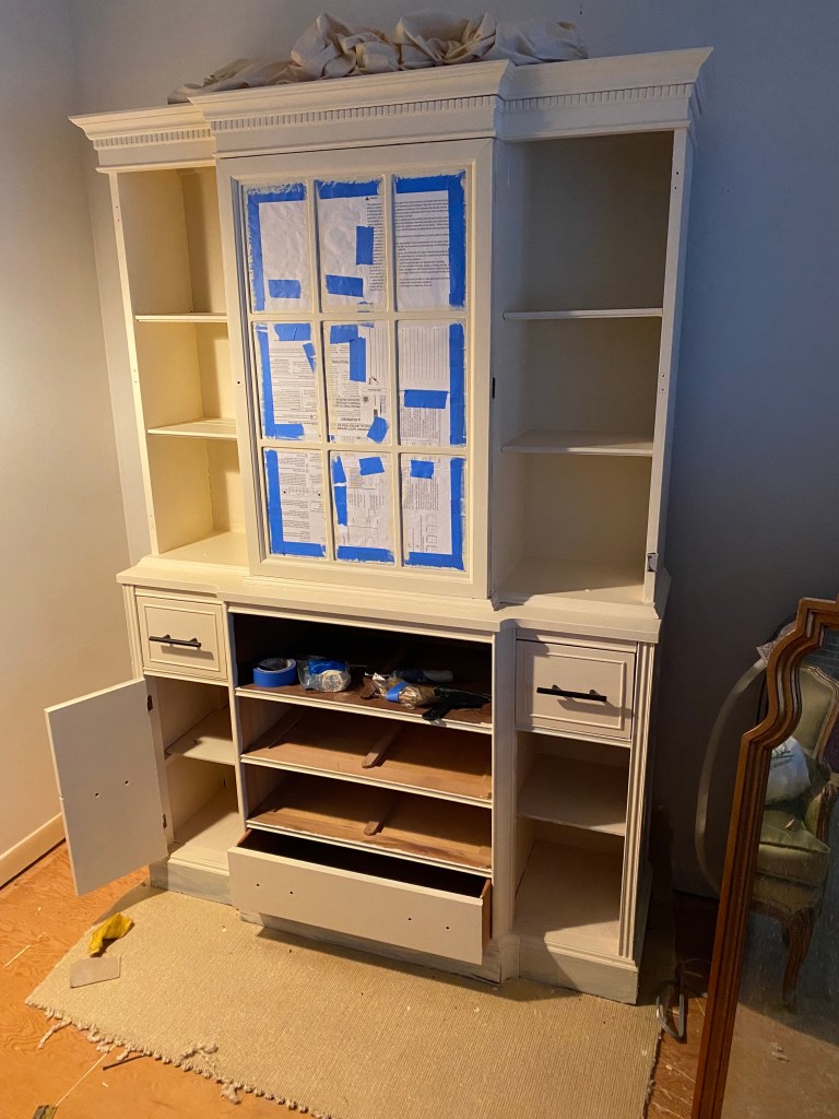 The first thing I did was take out all the drawers and take the doors off. I then sanded everything and put some tape and paper in the glass doors.