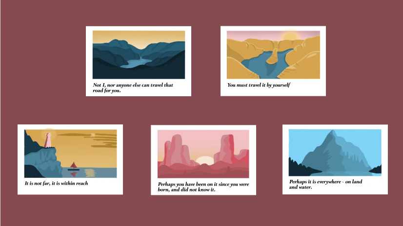 I wanted them like postcards, I think it adds more character to the nature scenes and the quote. This is also one of my favorite projects. I loved making the images. I kept with the same color palette to make it look more cohesive.