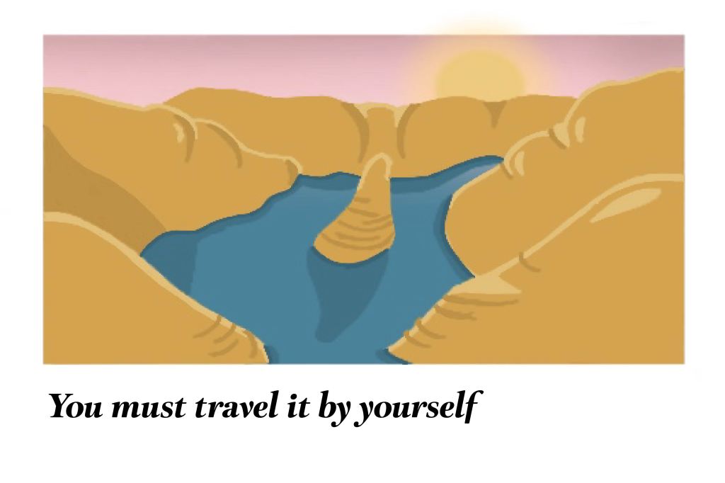 For this graphic design project we had to tell a story. I chose the quote “Nor I, not anyone else can travel that road for you. You must travel it by yourself. It is not far, it is within reach. Perhaps you have been on it since you were born, and did not know it. Perhaps it is everywhere – on land and water” written by Walt Whitman.